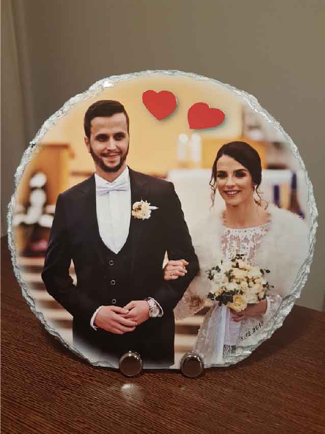 Facciamo dei tuoi momenti più belli un ricordo che resta nel tempo. Eseguiamo la stampa della tua foto su pietra di ardesia, la puoi personalizzare con date, nomi e piccole decorazioni in rilievo. Abbiamo a disposizione varie forme e misure, adattando e sfumando la foto in base alla forma scelta (rettangolare quadrata o rotonda). Può essere sostenuta da piedini in plastica nera o metallo cromato, completa di scatola.